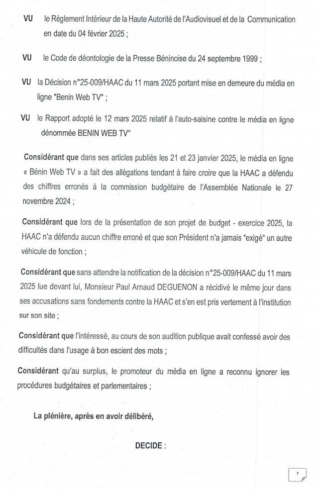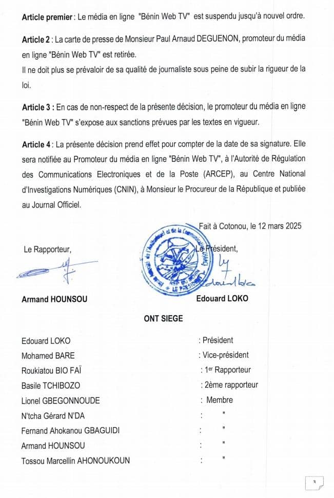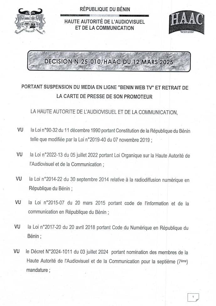 La Haute Autorité de l’Audiovisuel et de la Communication (HAAC) a pris une décision majeure, après l’audition publique du promoteur du média en ligne Bénin Web TV. Les choses sont allées très vite entre l’audition publique du 11 Mars 2025 et cette sanction intervenue ce mercredi 12 Mars 2025. Une décision motivée par la récidive du promoteur du Web média qui aura laissé perplexe plus d’un suite à son audition publique par l’institution de régulation présidée par Édouard Cocou LOKO.