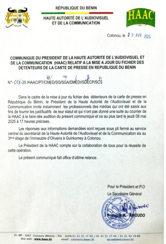 Selon le communiqué ci-dessus signé du Secrétaire général de la Haute Autorité de l’Audiovisuel et de la Communication (HAAC), les professionnels des médias dernièrement saisis par la HAAC aux fins de fournir des informations dans le cadre de la mise à jour du fichier des détenteurs de la carte de presse, ont jusqu’au jeudi 08 mai 2025 à 17 heures précises ( délai de rigueur), pour répondre. Une relance de dernière chance apparemment.