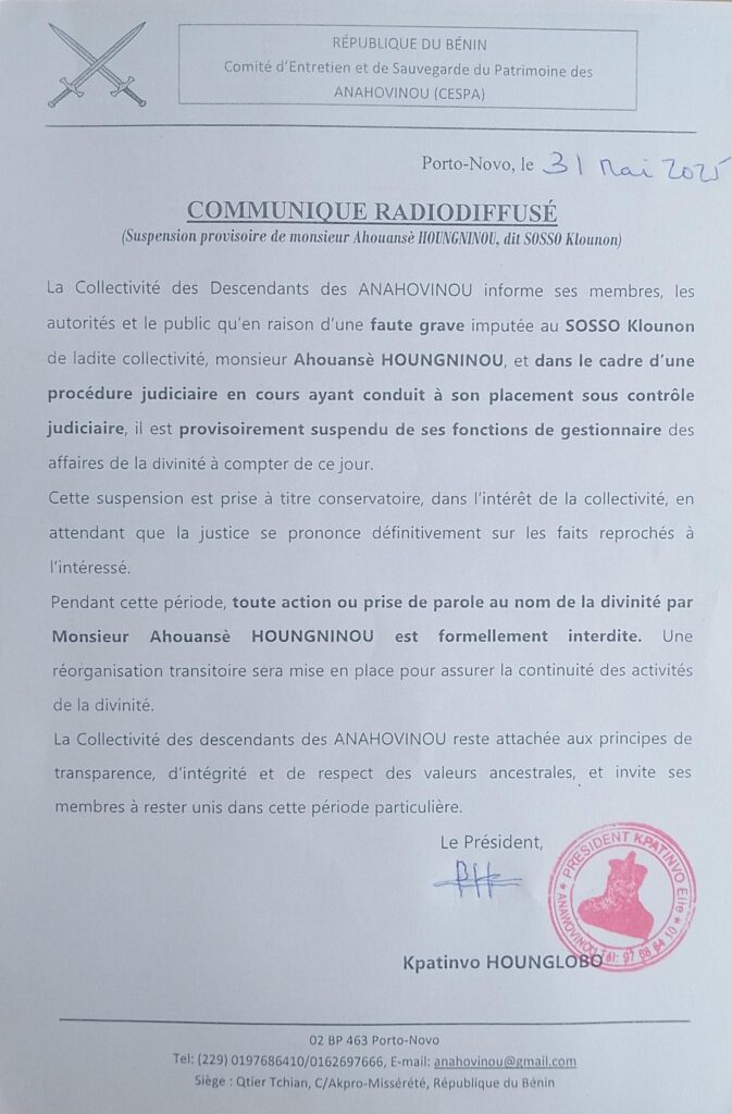 «Pendant cette période, toute action ou prise de parole au nom de la divinité par Monsieur Ahouansè HOUNGNINOU sont formellement interdites», lit-on dans le communiqué qui stipule que la collectivité des descendants des Anahovinou reste attachée aux principes de transparence, d’intégrité et de respect des valeurs ancestrales.