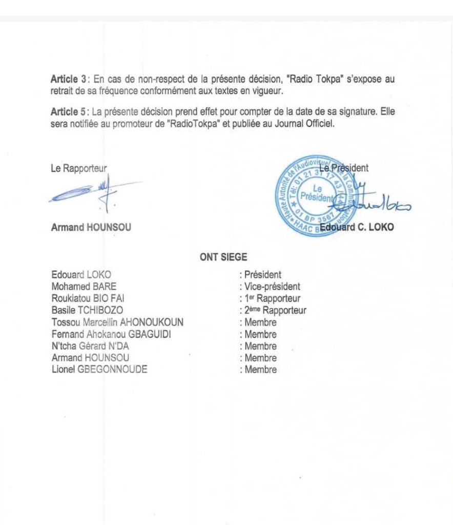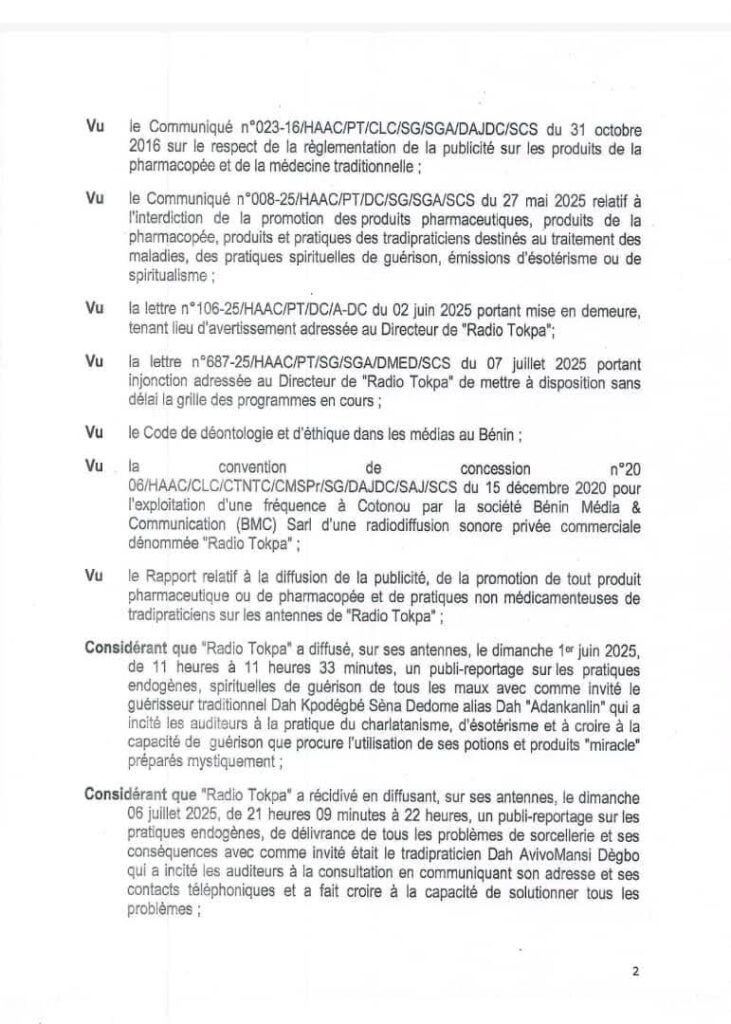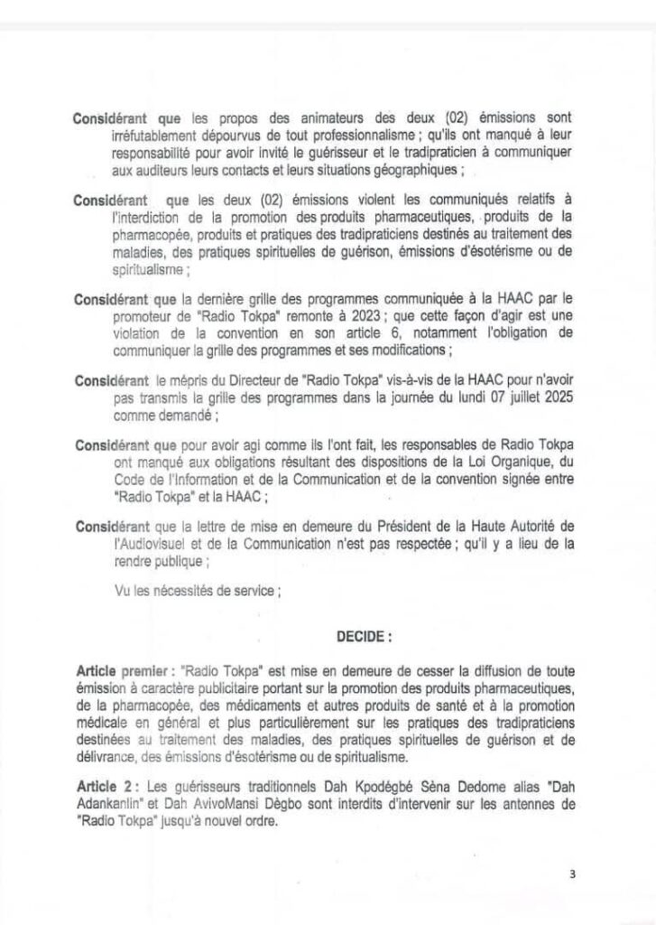La décision N’25-048 de la Haute Autorité de l’audiovisuel et de la Communication (HAAC) en date du 22 juillet 2025 met en demeure Radio Tokpa pour le motif ci-dessus et interdit les guérisseurs traditionnels Dah Adankanlin et Dah Avivomansi Dègbo d’antenne sur cette station radio jusqu’à nouvel ordre.