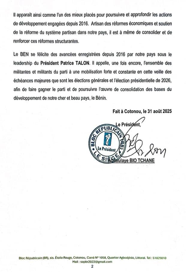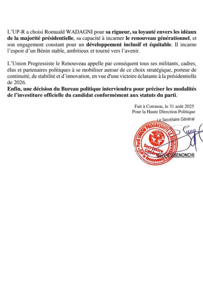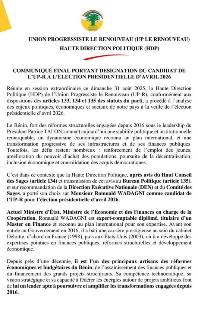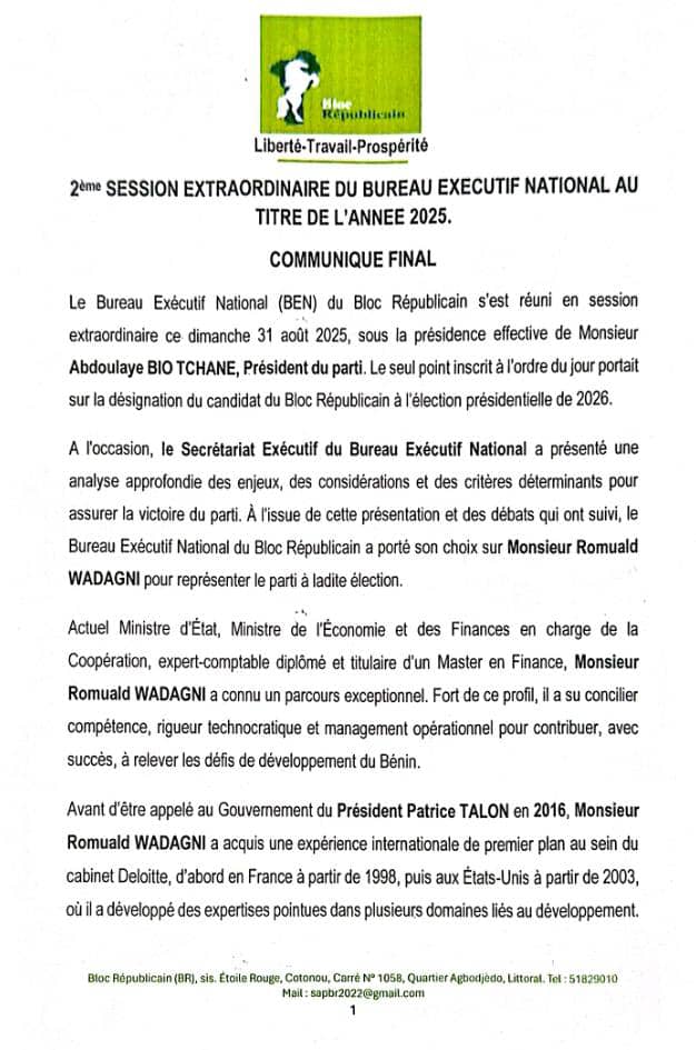 En effet, dans un communiqué officiel rendu public il y a quelques instants, le Bureau exécutif national (BEN) du Bloc Républicain a rendu public les conclusions de sa session extraordinaire de ce dimanche 31 août 2025. En substance, le BR affirme avoir porté effectivement son choix sur le ministre Romuald WADAGNI. « Il a su concilier compétence, rigueur technocratique et management opérationnel pour contribuer, avec succès, à relever les défis de développement du Bénin» peut-on lire dans dans le communiqué signé du président Abdoulaye BIO TCHANÉ. Le même exercice confirme la donne au niveau de l’UP le Renouveau Lire l’intégralité des communiqués ci-dessous 👇🏾👇🏾👇🏾