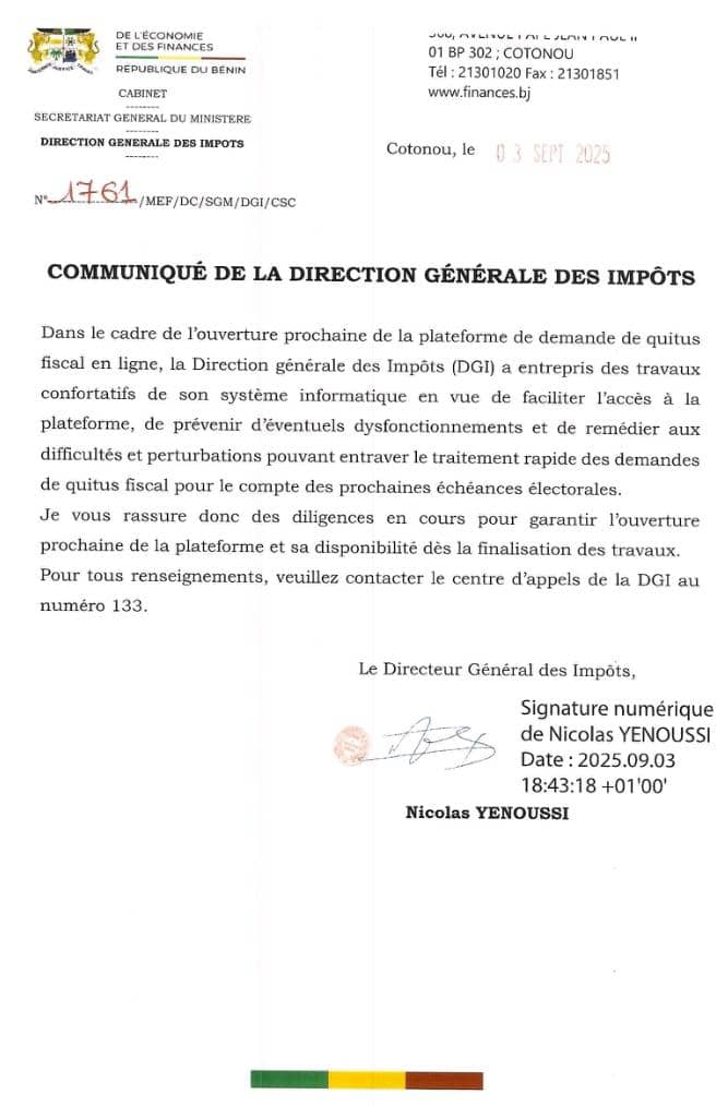 Dans le cadre du lancement imminent de la plateforme de demande de Quitus Fiscal en ligne, la Direction Générale des Impôts (DGI) a entrepris des travaux de renforcement de son système informatique. L’objectif est de faciliter l’accès à la plateforme, de prévenir les dysfonctionnements et de résoudre les difficultés pouvant entraver le traitement rapide des demandes, notamment dans le contexte des prochaines échéances électorales.