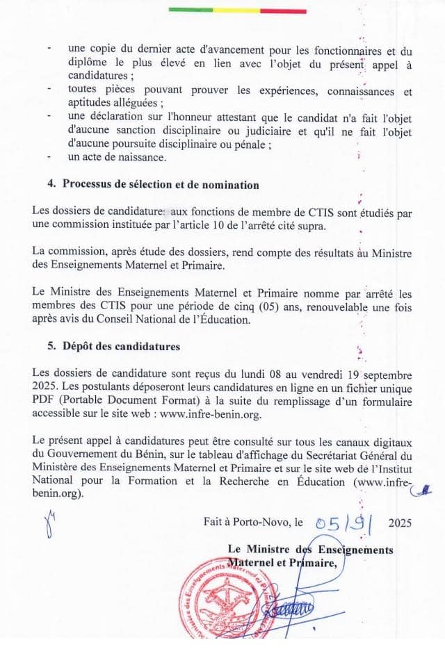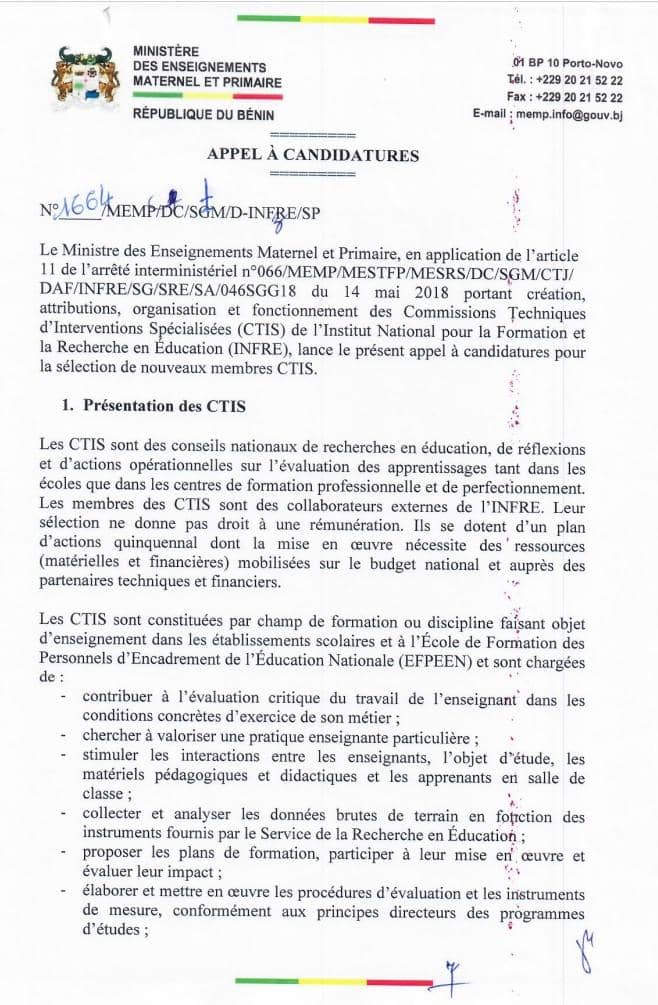 Les personnes intéressées pour siéger au sein des Commissions techniques d’interventions spéciales de l’Institut national pour la formation et la recherches en éducation (CTIS/INFRE) sont invitées à prendre part à cet appel à candidatures conformément à l’article 11 de l’arrêté interministériel n°066/MEMP/MESTFP/MESRS/DC/SGM/CTJ/DAF/INFRE/SG/SRE/SA046SGG18 du 14 mai 2018, portant création, attributions, organisation et fonctionnement des Commissions techniques d’interventions spéciales (CTIS) de l’Institut national pour la formation et la recherche en éducation (INFRE). Tous les détails ici 👇👇👇