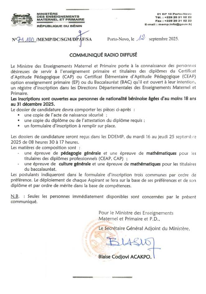Titulaires du CAP, du CEAP ou du BAC, âgés d’au moins 18 ans au 31 décembre 2025, ce communiqué vous concerne. Le Ministre des enseignements maternel et primaire (MEMP) invite les personnes désireuses et immédiatement disponibles à s’inscrire dans le registre d’inscription disponible dans les DDEMP. Les détails dans le communiqué 👇🏾👇🏾👇🏾