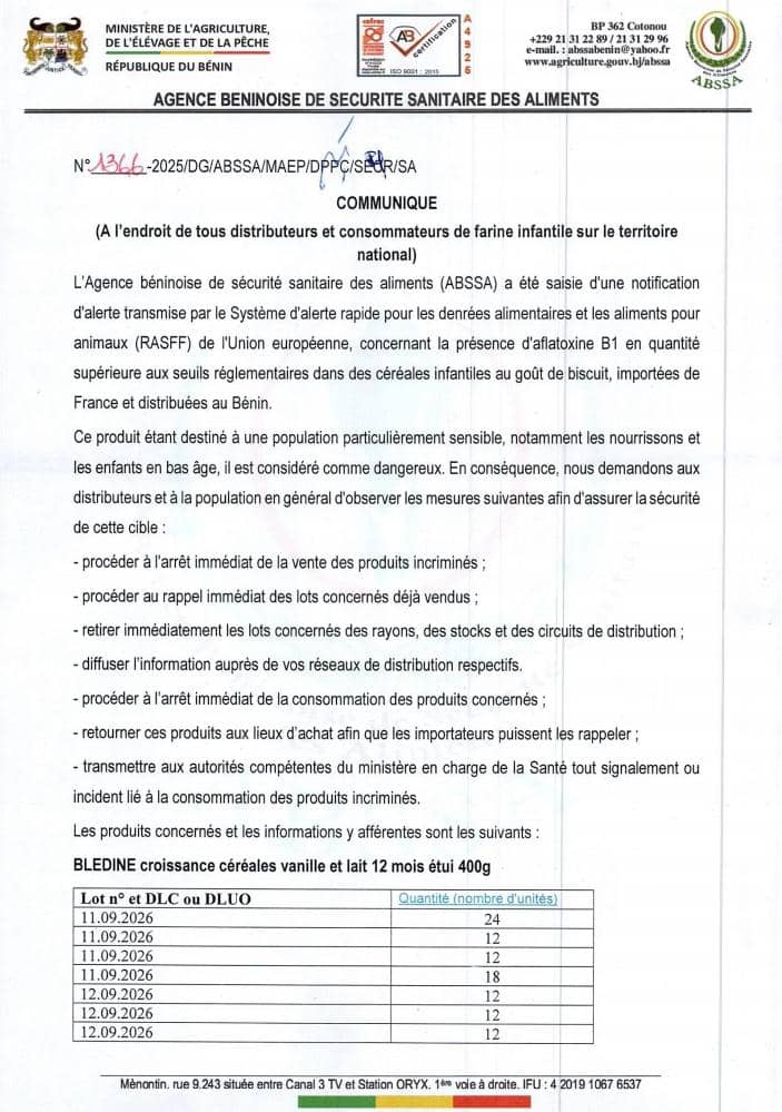 L’Agence Béninoise de Sécurité Sanitaire des Aliments (ABSSA) a tiré la sonnette d’alarme ce week-end, après avoir reçu une notification du Système d’alerte rapide pour les denrées alimentaires et les aliments pour animaux (RASFF) de l’Union européenne. Le signalement concerne des céréales infantiles au goût de biscuit, importées de France et déjà distribuées sur le marché béninois.