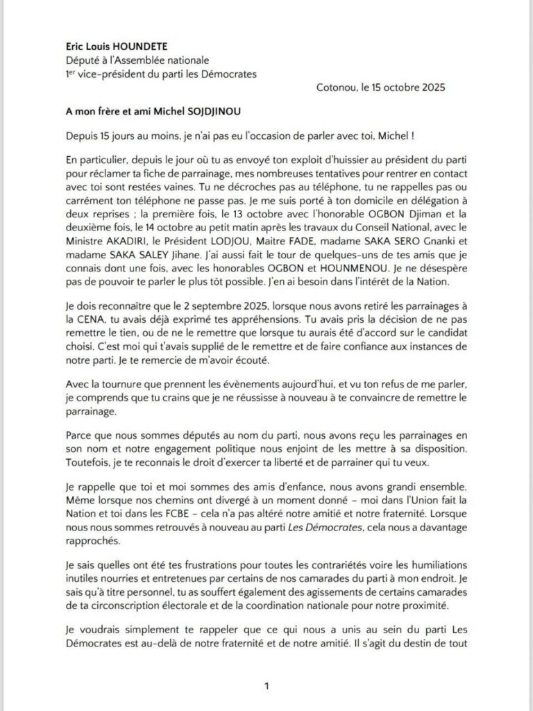 En clair, le député frondeur devrait être célébré pour sa constance, plutôt que couvert d’invectives, d’autant plus que le principal concerné, en la personne du vice-président Éric HOUNDÉTÉ, a cru devoir lui rendre justice à travers cette missive, dans laquelle il supplie l’honorable Michel SODJINOU de placer au-dessus de tout la participation du parti de Boni YAYI à l’élection présidentielle de 2026.