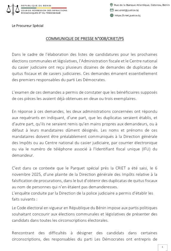 Selon le communiqué de presse n°008/CRIET/PS, signé du procureur spécial Elonm Mario Métonou, plusieurs dizaines de demandes suspectes ont été enregistrées auprès de l’Administration fiscale et du Centre national du casier judiciaire. Ces demandes provenaient, pour la plupart, de responsables du parti Les Démocrates.