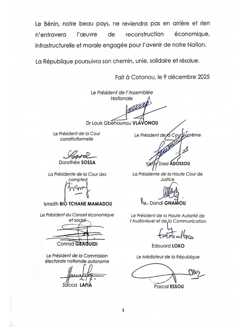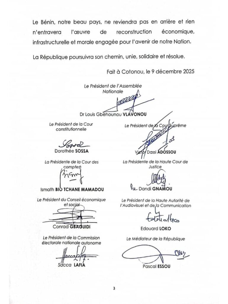 Dans une posture de fermeté, les institutions réaffirment leur soutien indéfectible au Président de la République, garant de la Constitution ; leur engagement à défendre et restaurer l’autorité légitime des institutions et leur détermination à préserver l’unité nationale et la démocratie. « Le Bénin ne reviendra pas en arrière », rassurent-ils avant d’ affirmer que rien n’arrêtera l’œuvre engagée pour la reconstruction économique, morale et infrastructurelle du pays. « La République poursuivra son chemin, unie, solidaire et résolue », ont-ils conclu.