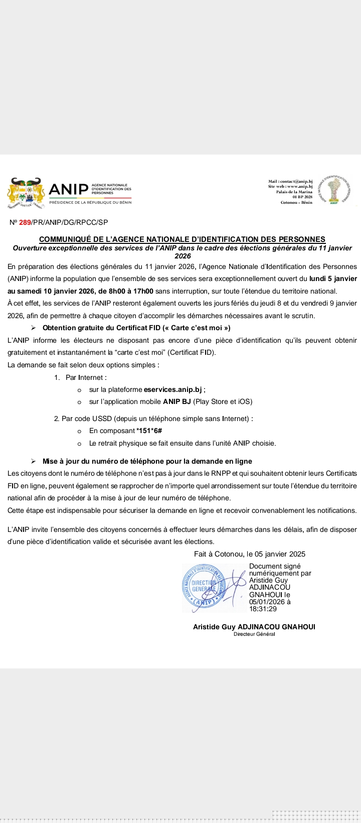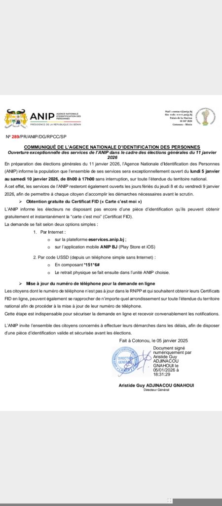 En prélude aux élections générales du 11 janvier 2026, l’Agence nationale d’identification des personnes (ANIP) annonce l’ouverture exceptionnelle de l’ensemble de ses services sur toute l’étendue du territoire national.