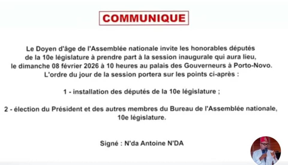 Le doyen d’âge de l’Assemblée nationale, N’da Antoine N’DA, a rendu public un communiqué invitant les honorables députés de la 10ᵉ législature à prendre part à la session inaugurale prévue pour le dimanche 8 février 2026 à 10 heures, au Palais des Gouverneurs à Porto-Novo.
