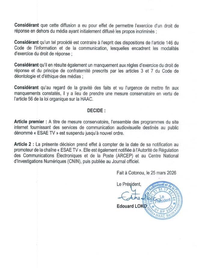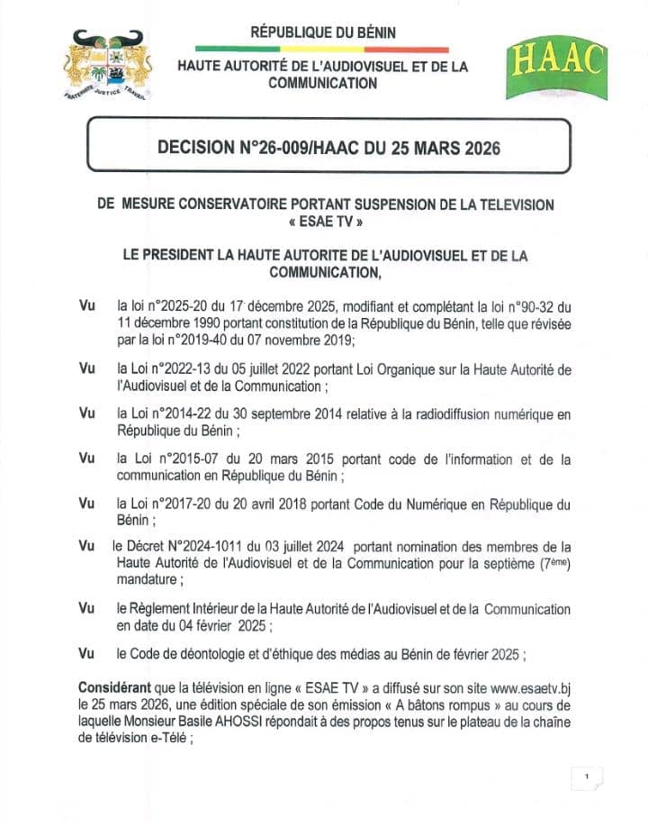 La Haute Autorité de l’Audiovisuel et de la Communication (HAAC) a ordonné, ce 25 mars 2026, la suspension conservatoire de la chaîne en ligne « ESAE TV ».
