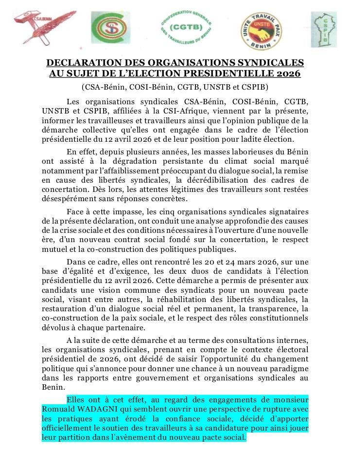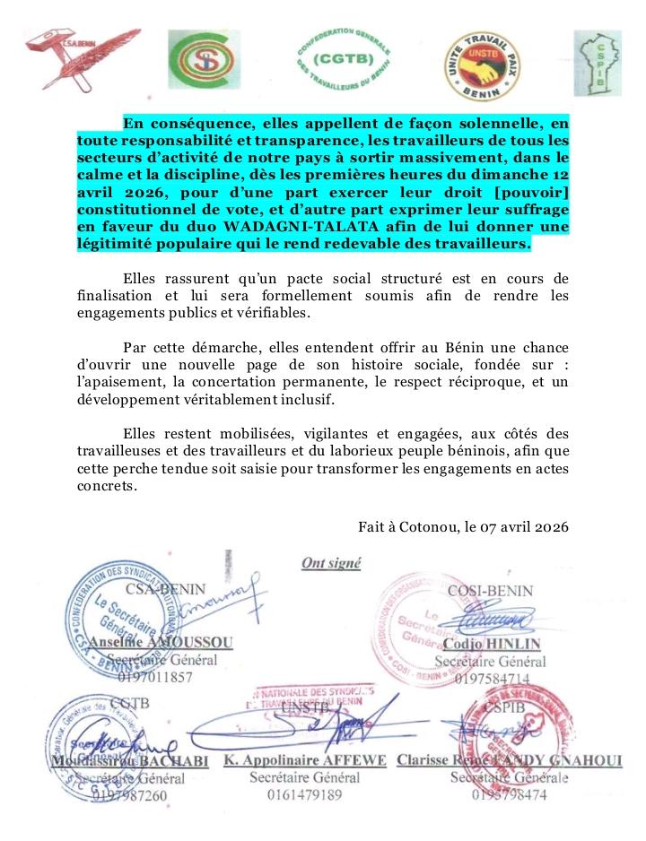 ActualitésPrésidentielle d’avril 2026: CSA Bénin, COSI Bénin, CGTB, UNSTB, CSPIB donne leur caution au duo WADAGNI TALATA by Journal L'Express7 avril 20267 avril 2026011 Share0 (Ils réaffirment leur adhésion à l’avènement du nouveau pacte social proposé par le candidat Président Romuald WADAGNI) Lire leur déclaration 👇🏾👇🏾👇🏾