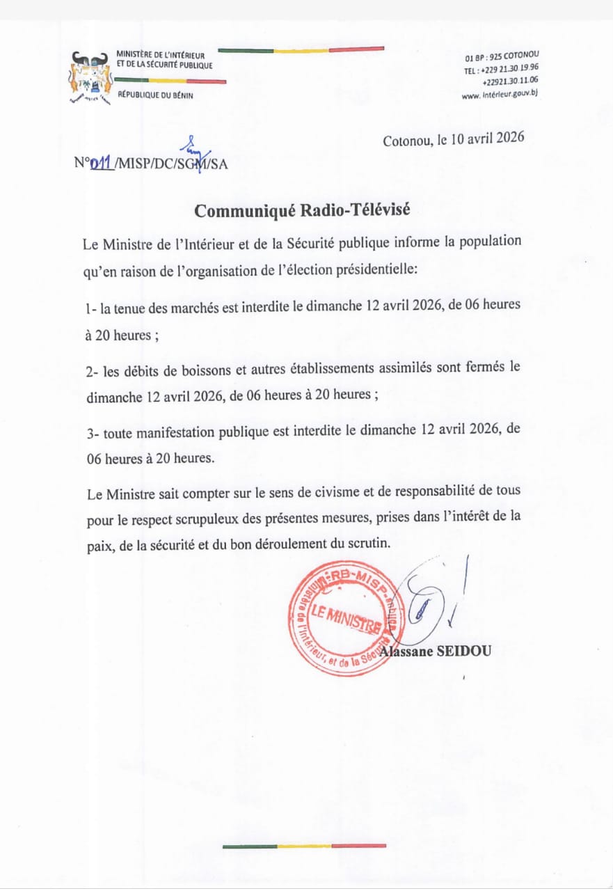 À l’approche de l’élection présidentielle du dimanche 12 avril 2026, les autorités béninoises ont pris d’importantes dispositions afin de garantir le bon déroulement du scrutin sur toute l’étendue du territoire national. Dans un communiqué officiel, le Ministère de l’Intérieur et de la Sécurité Publique a annoncé la fermeture temporaire de plusieurs activités économiques et de loisirs durant la journée électorale.