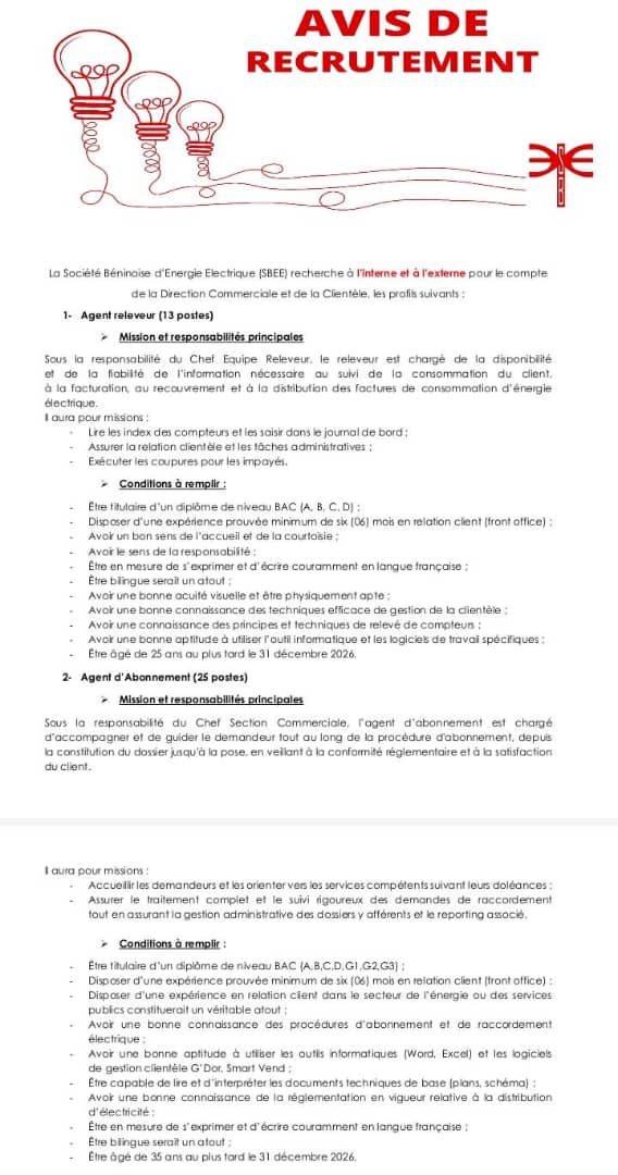 La Société Béninoise d’Énergie Électrique (SBEE) lance une campagne de recrutement visant à renforcer ses équipes au sein de la Direction Commerciale et de la Clientèle. Plsieurs dizaines de postes sont à pourvoir, aussi bien en interne qu’à l’externe.
