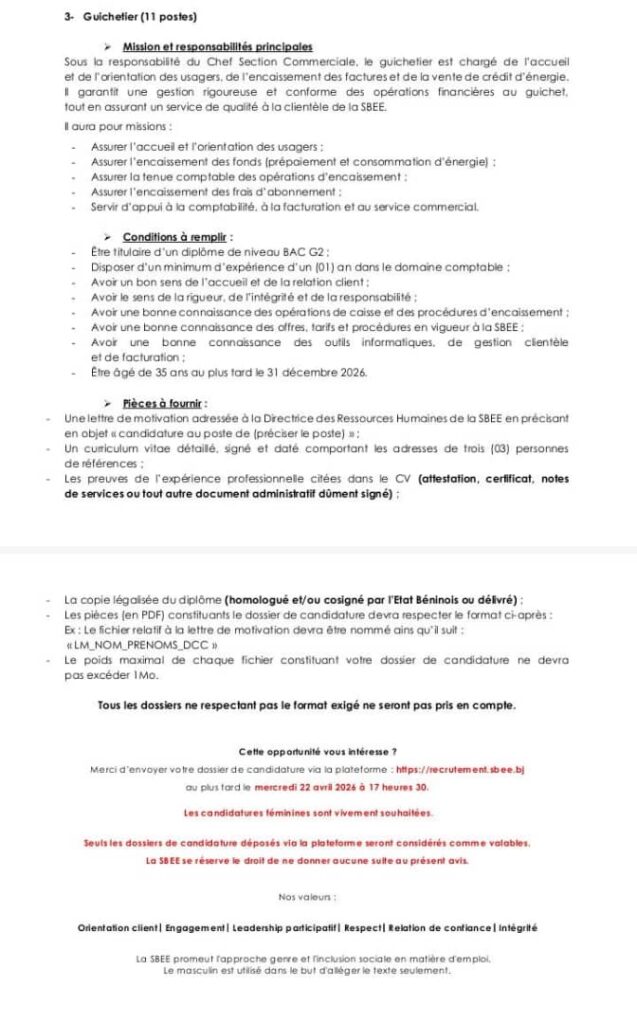 Les candidatures sont attendues au plus tard le 22 avril 2026 à 17h30 via la plateforme dédiée de la SBEE. L’entreprise encourage vivement les candidatures féminines et rappelle que seuls les dossiers respectant les conditions requises seront examinés.