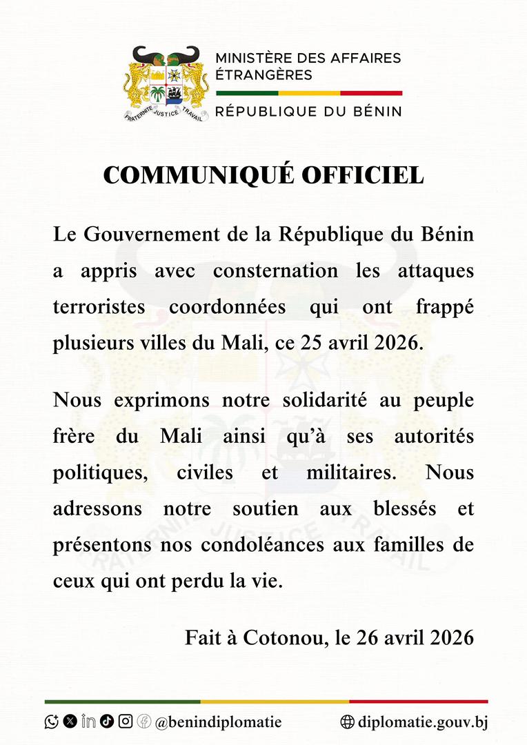 Le gouvernement de la République du Bénin a réagi avec une profonde consternation aux attaques terroristes coordonnées survenues le 25 avril 2026 dans plusieurs localités du Mali.