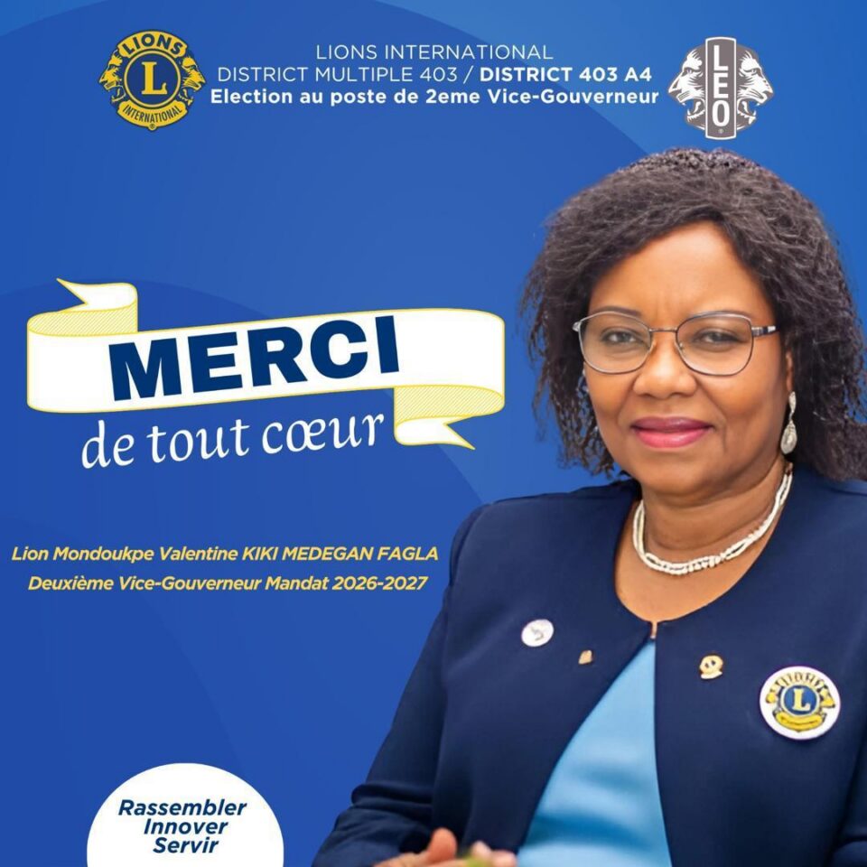 Fraîchement élue Deuxième Vice-Gouverneur du District 403-A4 pour le mandat 2026-2027, Lion Valentine Kiki Medegan Fagla adresse un message empreint de reconnaissance à l’ensemble des acteurs Lions et LEO. Entre remerciements appuyés, appel à l’unité et réaffirmation de son engagement au service, elle inscrit son mandat sous le sceau du leadership partagé et de l’action collective. Lire ci-dessous l’intégralité de son message de remerciement 👇🏾👇🏾👇🏾